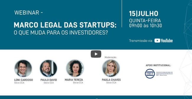 Data: 15.07.2021 Tipo de Evento: Palestra – Webinar: Assunto: MARCO LEGAL DAS STARTUPS: O que muda para os investidores? Participantes Sócios do CCA Local: Online Realização: IBEF Minas Gerais