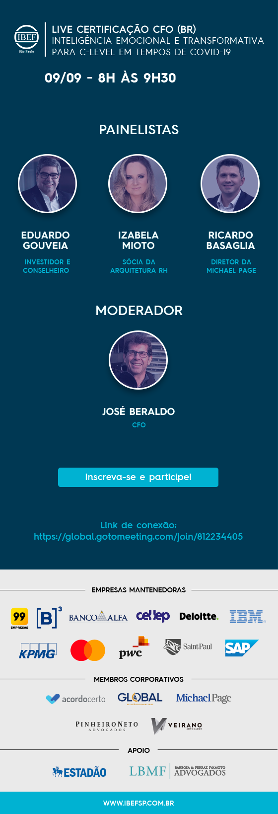 Olá, O IBEF SP convida a todos os associados e amigos do IBEF Minas Gerais, para mais uma Live voltada para educação continuada de CFO´s Desta vez o tema é : Inteligência Emocional e Transformativa para C-Level em tempos de COVID-19 Quando: 09/09/20 de 8h às 9h30 Não Percam!! Link…
