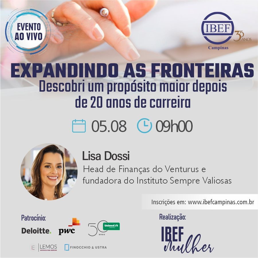 IBEF Campinas convida associados e amigos do IBEF Minas Gerais. Lisa Dossi, Head de Finanças do Venturus e fundadora do Instituto Sempre Valiosas estará conosco para mais um evento realizado pelo IBEF Mulher. Mesmo após anos no mercado corporativo, Lisa decidiu que era hora de inovar! Criou o Instituto Sempre Valiosas para ajudar…