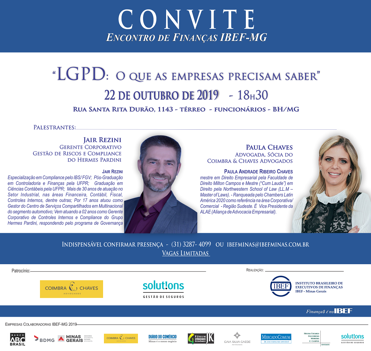 Com a participação do Sr. Jair Rezini – Gerente Corporativo Gestão de Riscos e Compliance do Grupo Hermes Pardini, da Sra. Paula Chaves – Advogada, Sócia do Coimbra & Chaves Advogados e do Sr. Sergio Frade – Diretor Presidente da Solutions Gestão de Seguros