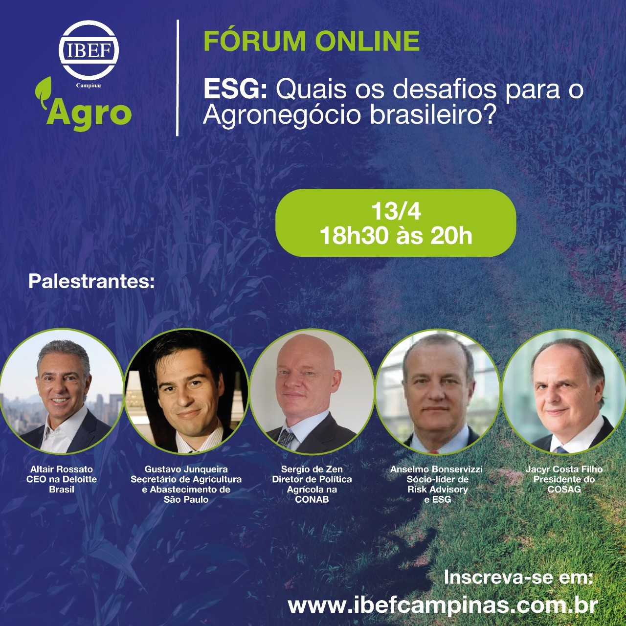 No dia 13.04.2021, o IBEF Campinas promoverá um evento sobre ESG e os Desafios do Agronegócio Brasileiro. Contaremos com especialistas no assunto e também será inaugurado o Comitê IBEF Agro. Abaixo o convite do evento: